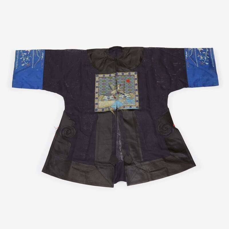 A Chinese dark blue informal 'pufu' robe with badges late qing dynasty