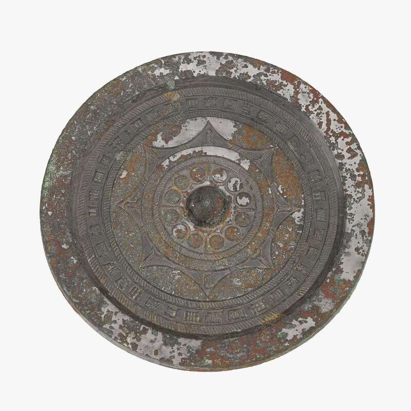 decorated twelve bosses near central knob within an octagonal star design, surrounded by a ring of archaic characters, patina encrustation to side and reverse of mirror.