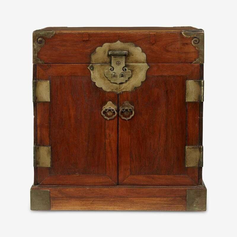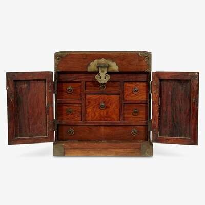 of typical rectangular form, the top and doors open to reveal seven interior drawers.