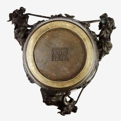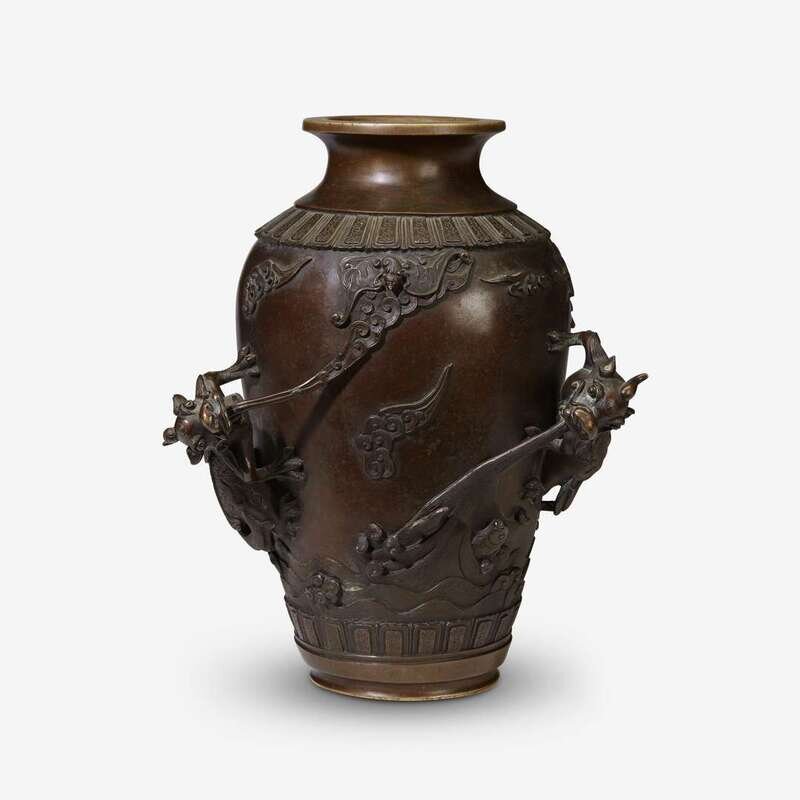 of ovoid form tapering to base and with everted rim, three qilong on surface issue from their mouths the elements of air, fire and water respectively in and around which are seen a bat, a carp, a phoenix and billowing clouds, well-cast lappet bands at shoulder and near foot.
