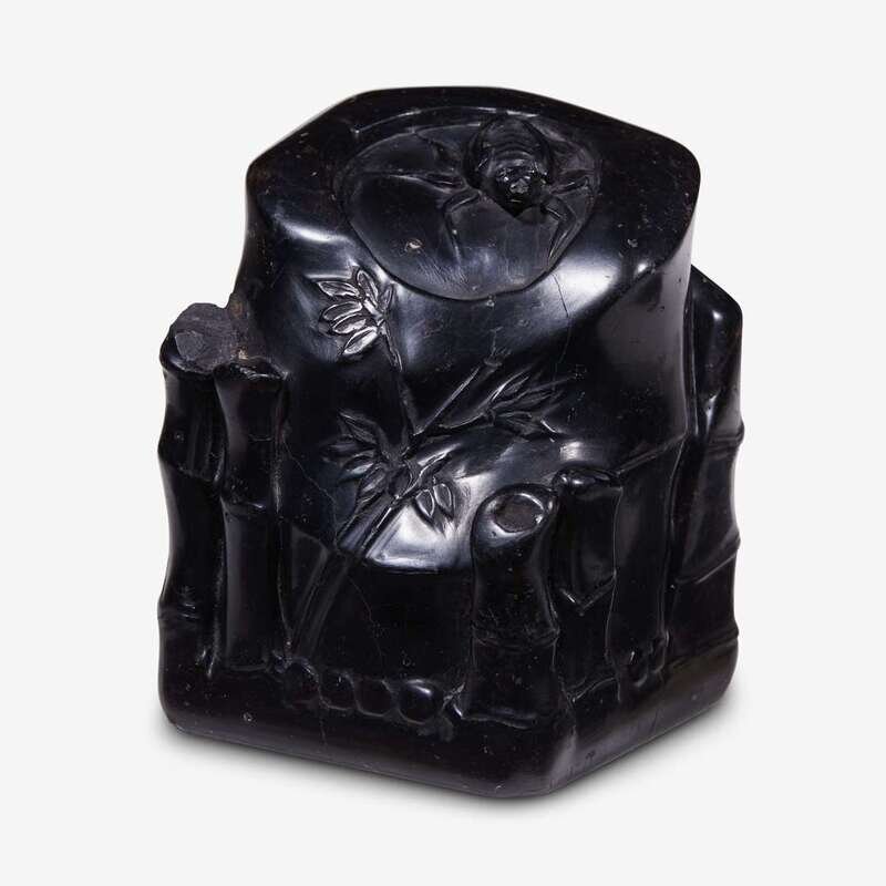 carved as a large section of bamboo cut diagonally at top where rests an insect and with smaller bamboo stalks at corners, obscure and lengthy seal matrix references scholarship.