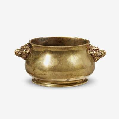 the compressed globular body rising from a flared foot, the sides with twin zoomorphic mask handles, the base with an apocryphal Xuande mark.