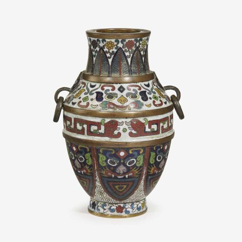 of ovoid form with twin ring handles, decorated in a light palette with mixed archaistic elements.