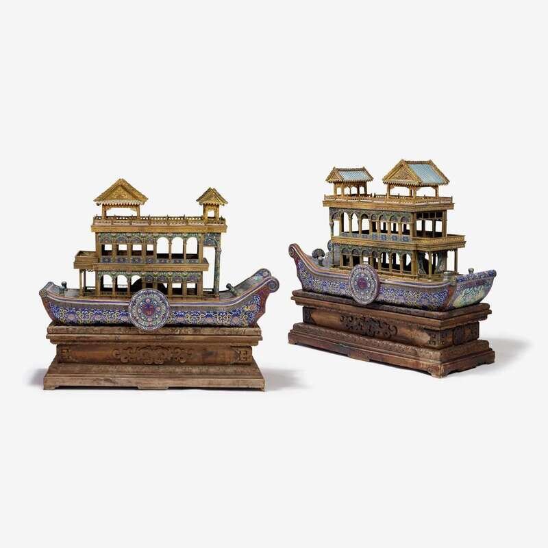 A large and rare pair of Chinese cloisonné enamel boat models in the form of the Empress Dowager's boat-form pavilion early 20th century
