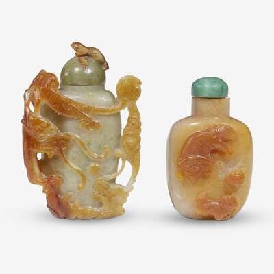 the first carved in high relief with two fu lions playing ball, incised verso to show ruyi scepter; the second utilizing the skin to highlight the carving of two dragons fighting over a fire ball, with a mysterious creature on top of stopper. (2).