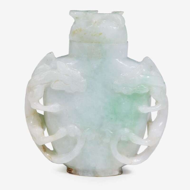 A Chinese jadeite carved 'twin chilong' snuff bottle republic period
