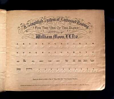1 vol. Oblong, thick folio, original flexible boards, paper spine label. Embossed and letterpress title, text leave embossed on rectos. On title: "A Simplified System of Embossed Reading for the use of the Blind. Invented by William Moon." Internally crisp and clean.