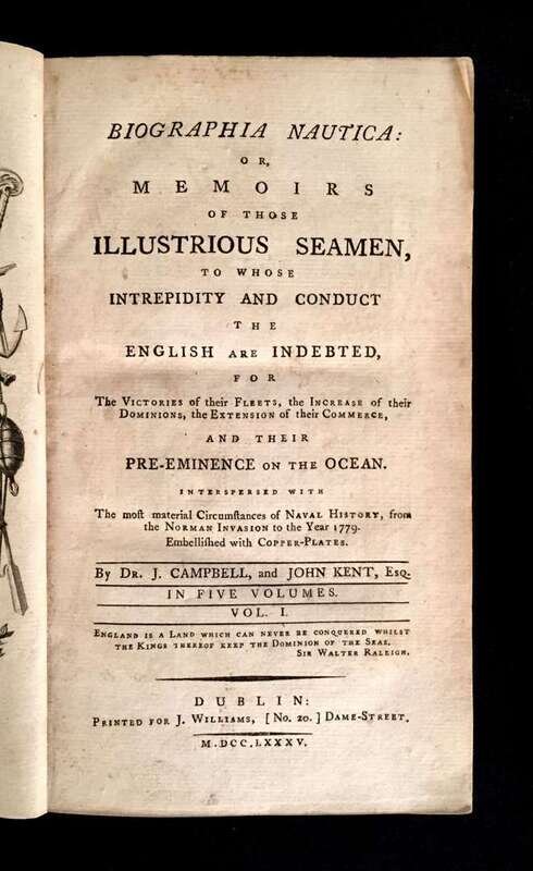 (Travel and Exploration : Maritime History). Campbell, John; Kent, John. Biographica Nautica: or, Memoirs of those Illustrious Seamen,... the English are Indebted. Dublin: J. Williams, 1785.