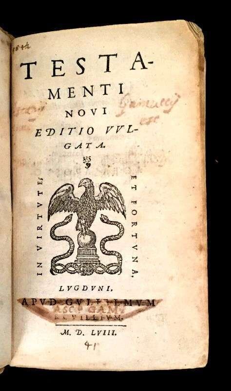 (Bible in Latin : New Testament). Testamenti novi editito vulgata. Lyon: Guiliemum Rouillium, 1558.
