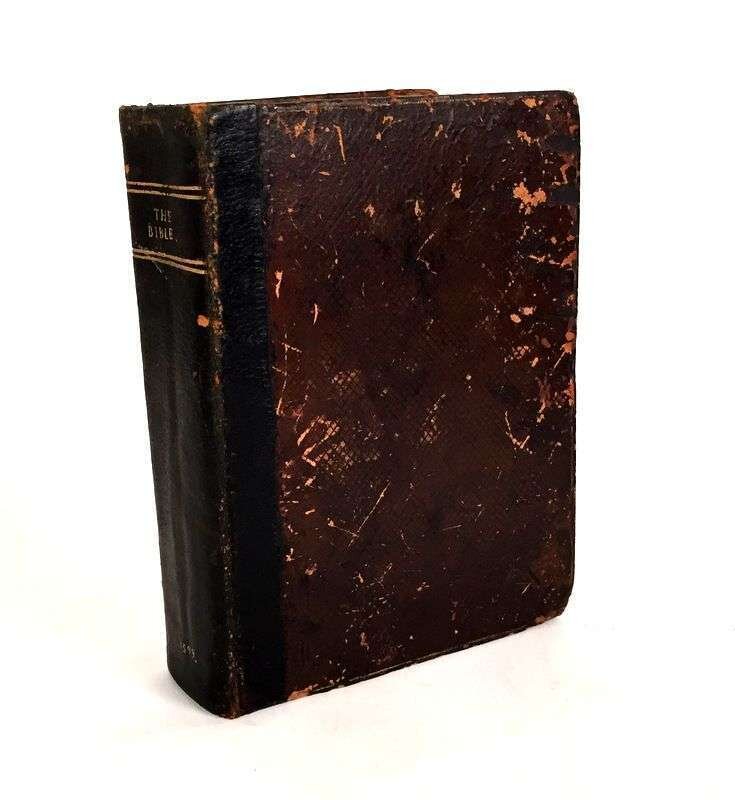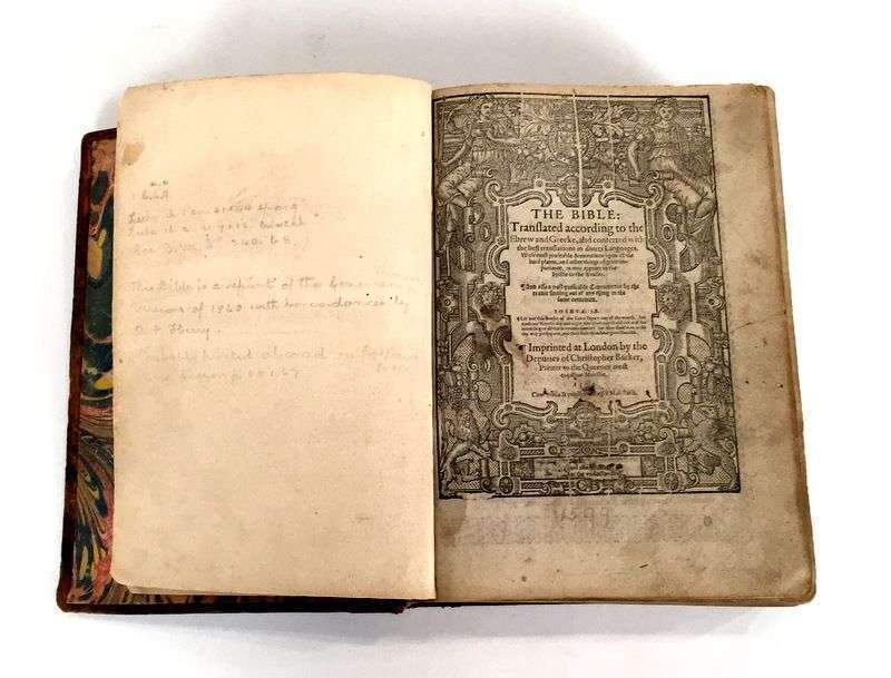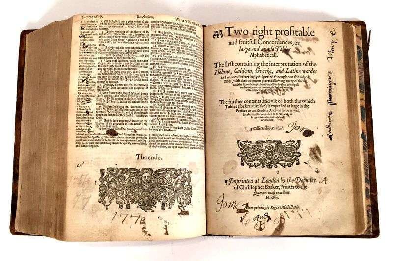 1 vol. 4to, old diced calf, unprofessionally rebacked in brown pig skin; scattered wear. 2 small holes in general title page, losses to imprint date, bottom of ornamental border; New Testament title page repaired, negligible losses; damage to folio 6, paper loss to marginal notes and text; bottom corner of folio 148 torn away with loss of text; much of top of folio 467 torn away; some loss of text at bottoms of leaves 538 and 541. Black letter, leaf size 218 x 153 mm - a few heads shaved close, marginal notes almost entirely in roman type, a large number of the errors corrected. With 2 preliminary leaves, 1) title on recto, Of the Incomparable Treasure on verso; 2) To the Christian Reader on recto, Howe to take Profite on verso. Text ends on folio 554 (really 552), table ends on L2. Bound without the Apocrypha. Separate General, New Testament, Table, and Concordances title pages.