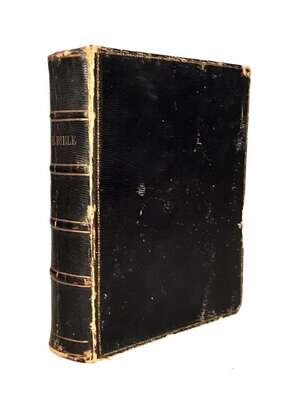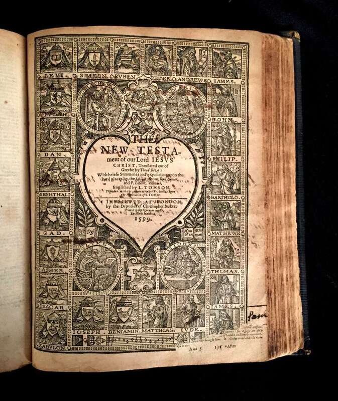 1 vol. 4to, later straight-grained morocco; worn. 2 preliminary leaves, Old Testament (ending complete at Qq7). With: The New Testament: Deputies of Christopher Barker, 1599. 4to. 2 preliminary leaves, books of the New Testament, Table (11 leaves, ending complete at Rr4). Losses to head of general title and bottom fore edge portion of New Testament preliminary leaves (including title page), trimmed with losses to printing at heads and shoulders. Several leaves defective, some toning and spotting, old underscoring almost throughout, but all leaves present. Bound without Junius Revelations. Black letter Geneva Bible.