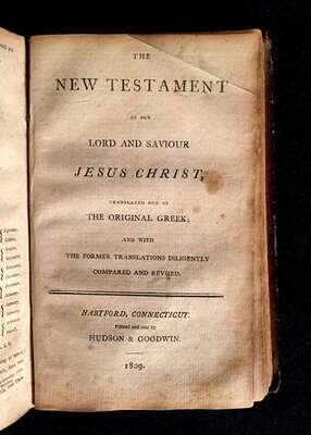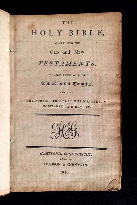 (Bible in English.) The Holy Bible, containing the Old and New Testaments. Hartford, Connecticut: Hudson & Goodwin, 1810. First Connecticut printing of the New Testament bound with the second Connecticut printing of the Old Testament.