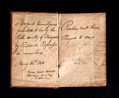 1 vol. 12mo, contemporary sheep; scuffed, joints and spine ends rubbed. With separate New Testament title page, dated 1809. Scattered light spotting, dust smudging to slightly toned. Contemporary and near contemporary ink manuscript birth records on back end papers. Ink manuscript presentation from the Bible Society of New York, dated May 30, 1811 on front pastedown.