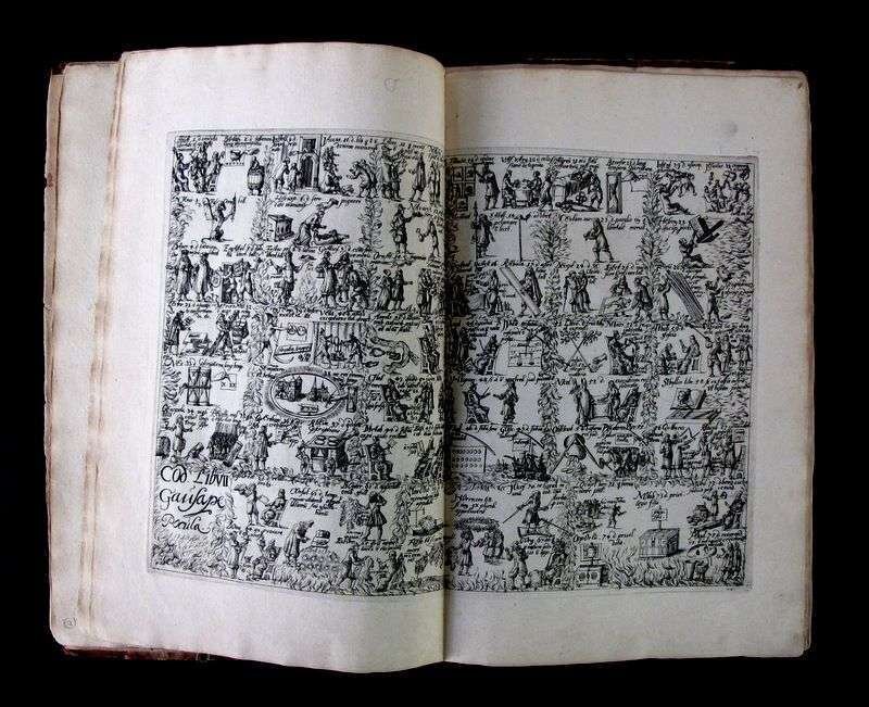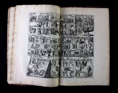 1 vol. Collection of 31 Plates (30 double-page or folding) bound from the works above, meant to serve as visual mnemonics for the study of Justinianic law, &c. Folio. Old boards, worn, occasionally rubbed, bottom of spine gone, binding. starting to break. A few small repairs, minor foxing, but generally clean.