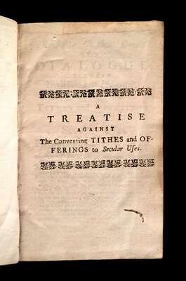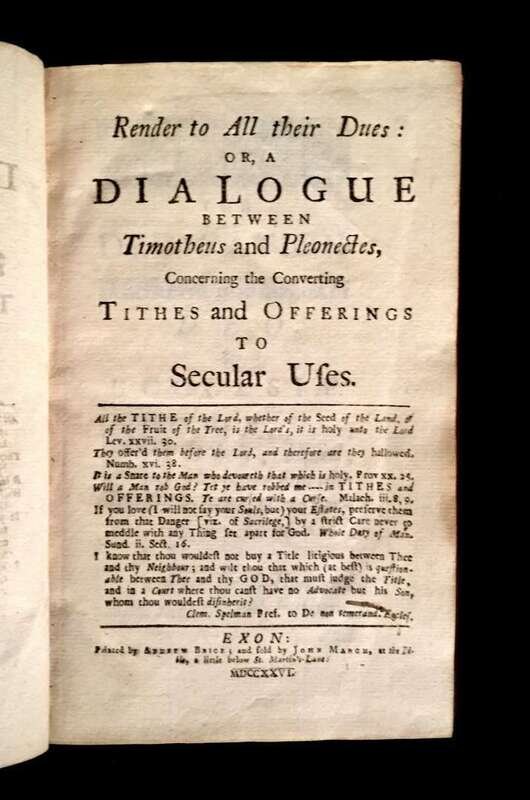 (Early English Imprints). (Southcomb, Lewis.) Render to All their Dues: or, a Dialogue between Timotheus and Pleonectes Concerning the Conferring of Tithes and Offerings to Secular Uses. Exon: Andrew Brice for John March, 1726. First edition.