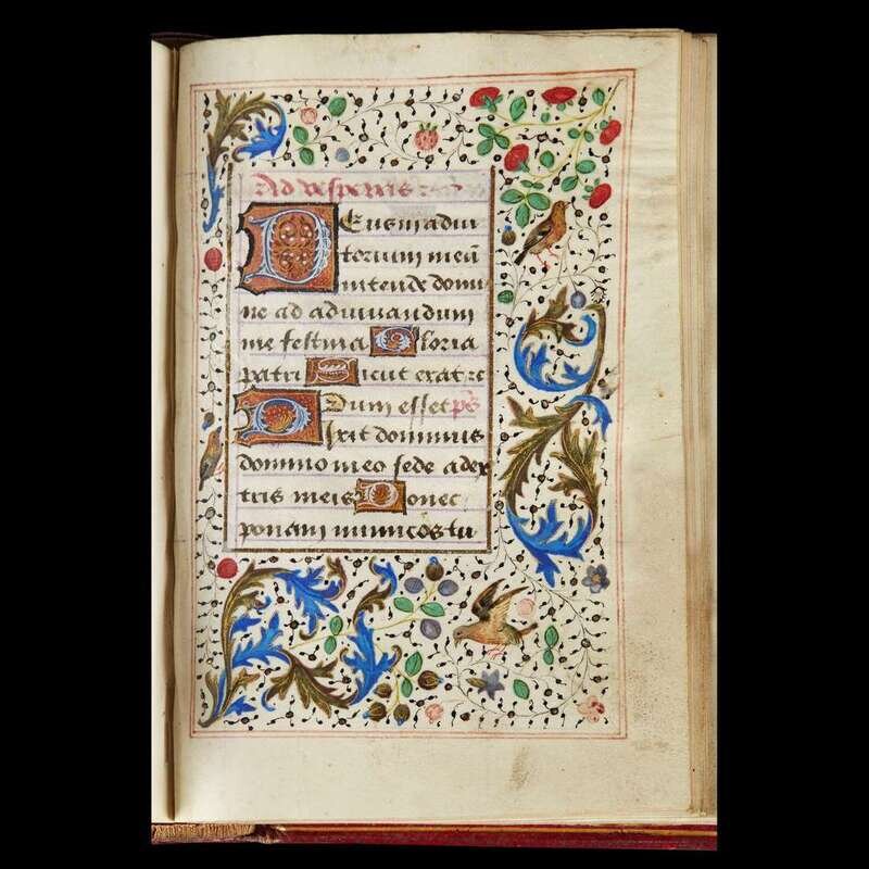 1 vol. 5 1/4 x 3 1/2 inches; 133 x 89 mm, 19th century richly gilt geometric red morocco, richly gilt foliate and geometric spine compartments, occasionally slightly scuffed. 189 leaves, 2 blank vellum leaves at front and back. Color initials throughout, with 10 gilt-illuminated, color foliate and avian decorated rectos. Old sewn repair in in blank bottom margin of folio 176, old sewn repair touching gutter edge of manuscript at folio 187, very occasional minor dampstaining on a few blank margins, but internally generally clean and bright.