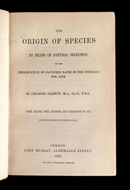 (Scranton Estate : Science). 15 vols Darwin, Charles: Journal of Researches into Natural History and Geology... Voyage of H. M. S. 'Beagle'... London: John Murray, 1882. "Fifteenth Thousand." Freeman 38 * The Origin of Species by Means of Natural Selection. London: John Murray, 1882. "Sixth Edition." Freeman 407 * The Various Contrivances by which Orchids are Fertilised by Insects. London: John Murray, 1882. "Second Edition, Revised." Woodcut illustrations. Freeman 803 * The Movement and Habits of Climbing Plants. London: John Murray, 1882. "Third Thousand." Figures in text. Freeman 839 * The Variations of Animals and Plants under Domestication. London: John Murray, 1882. "Second Edition, Revised. Fifth Thousand." 2 Vols. Freeman 883 * The Descent of Man, and Selection in Relation to Sex. London: John Murray, 1882. "Second Edition, Revised and Augmented. Fifteenth Thousand." Illustrated. Freeman 995 * The Expression of the options in Man and Animals. London: John Murray, 1873. "Tenth Thousand." With 7 photo plates, other illustrations, without the 3 fold plates - as usual. Freeman 1144 * Insectivorous Plants. London: John Murray, 1876. "Fourth Thousand." Illustrated. Lacking errata. Freeman 1221 * The Effects of Cross and Self Fertilisation in the Vegetable Kingdom. London: John Murray, 1878. "Second Edition." Freeman 1251 * The Different Forms of Flowers on Plants of the Same Species. London: John Murray, 1880. "Second Edition." Illustrated. Freeman 1279 * The Power of Movement in Plants. London: John Murray, 1882. "Third Thousand." Illustrated. Freeman 1328 * The Formation of Vegetable Mould. London: John Murray, 1882. "Seventh Thousand (Corrected)." Illustrated. Freeman 1365 * Krause, Ernst. Erasmus Darwin. London: John Murray. 1879. First English-language edition. Frontispiece portrait, illustrations. Freeman 1319 * Muller, Fritz. Facts and Arguments for Darwin. London: John Murray, 1869. First English- language edition. Illustrated. All 8vo, late 19th century uniform 3/4 tan calf and marbled boards, spines gilt, t.e.g., morocco spine labels; joints, corners, spine ends rubbed, spines scuffed, joints often tender, front cover of Origin of Species detached but present. Internally clean and complete unless otherwise indicated. Scranton ownership, dated 1884 on front blanks.