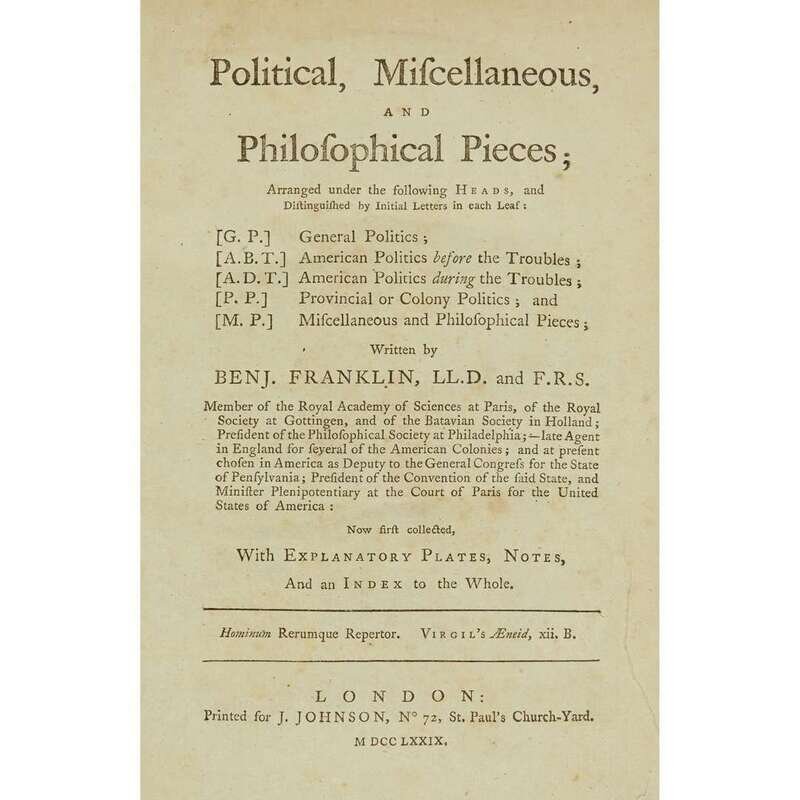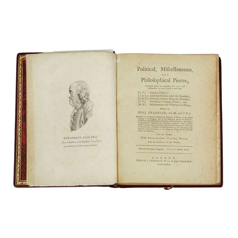 (Scranton Estate : Americana). Franklin, Benjamin. Political, Miscellaneous, and Philosophical Pieces. London: for J. Johnson, 1779.