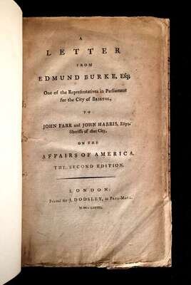 (Scranton Estate : Americana). Burke, Edmund. A Letter from Edmund Burke, Esq;... to John Farr and John Harris,... on the Affairs of America. London: J. Dodsley, 1777. "The Second Edition."