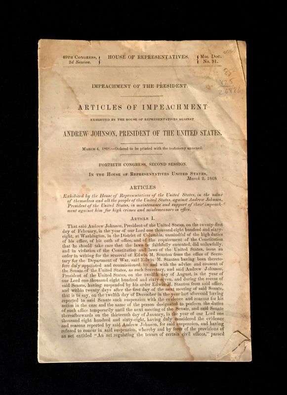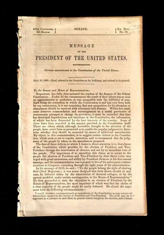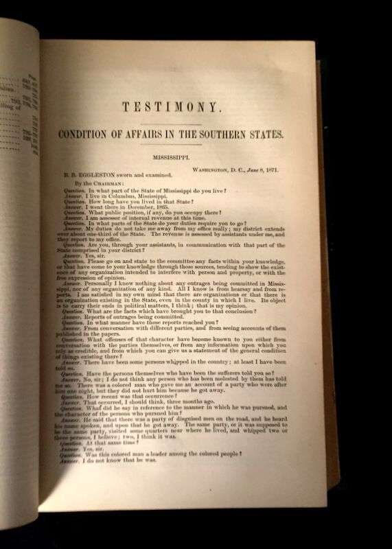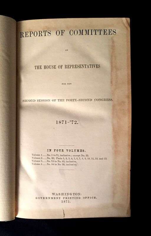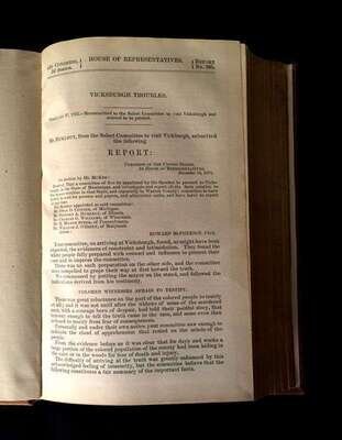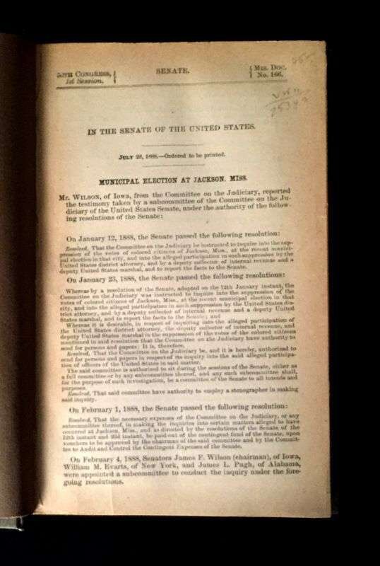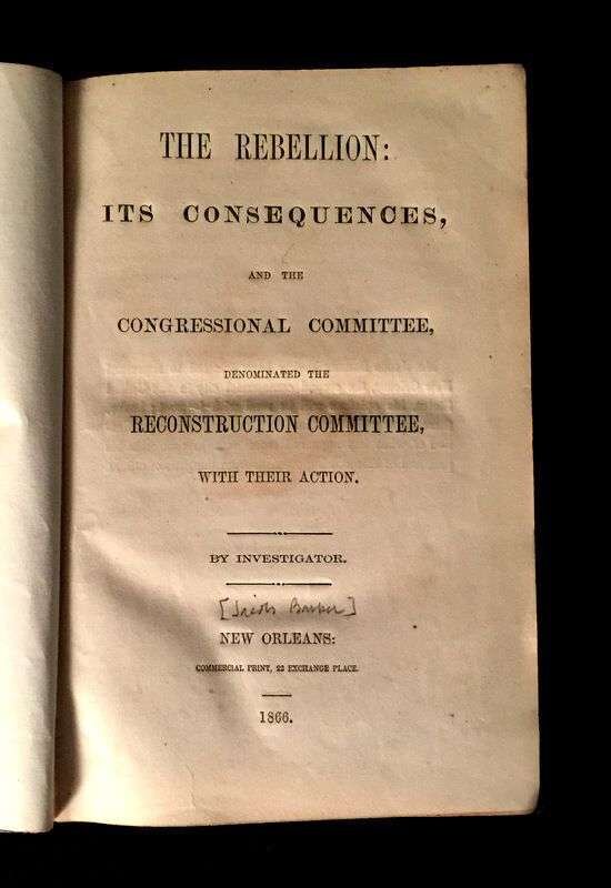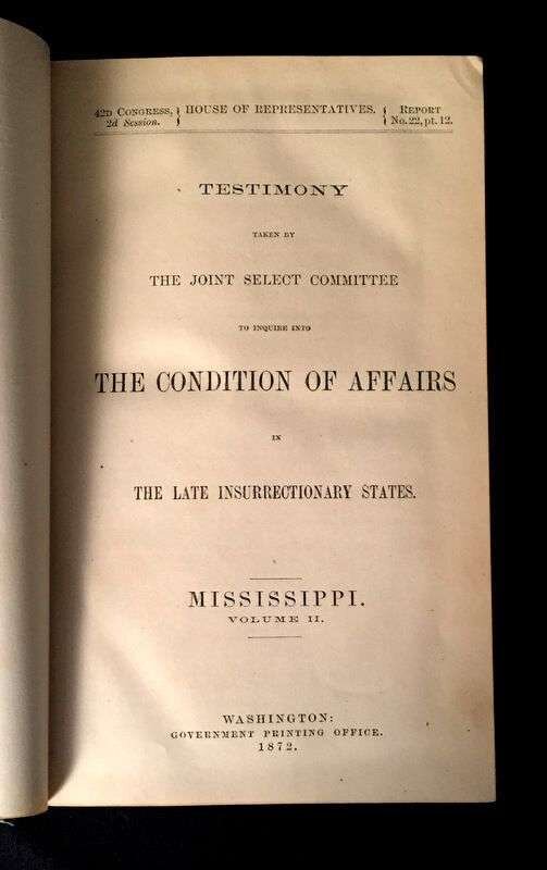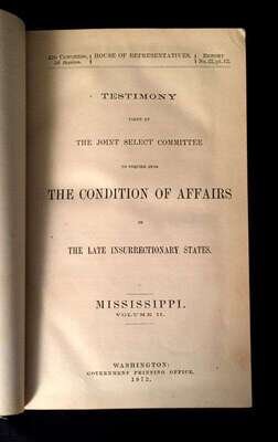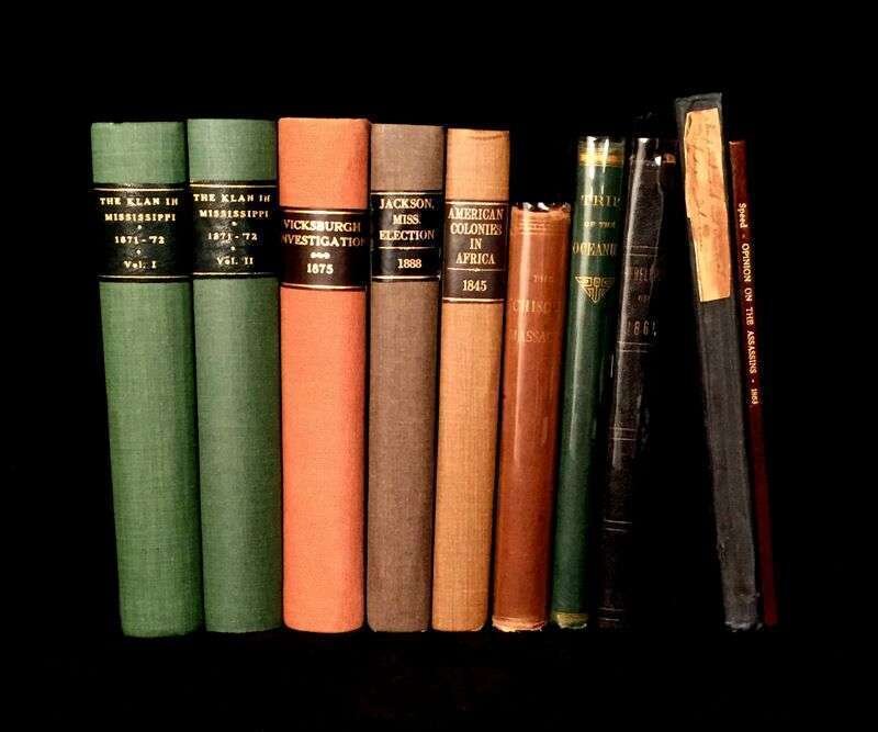 (Scranton Estate : Americana). 10 Vols. American Civil War, its Aftermath, and Reconstruction: (French, J. Clement; Cary, Edward.) The Trip of the Steamer Oceanus to Fort Sumter and Charleston, S.C. Brooklyn, 1865. 8vo, original green cloth. Frontispiece, full page illustrations, errata. Light wear. * (Baker, Jacob.) The Rebellion, its Consequences, and the Congressional Committee, Denominated the Reconstruction Committee, with their Actions. New Orleans, 1866. 8vo, original black morocco-backed cloth. Tinted lithographic portrait. Light wear. * (Lincoln, Abraham). Speed, James. Opinion on the Constitutional Power of the Military to Try and Execute the Assassins of the President. Washington: G.P.O., 1865. 8vo, modern boards. Internally clean, trimmed - no loss of printing. * The Great Impeachment and Trial of Andrew Johnson, President of the United States. Philadelphia: T. B. Peterson, (1868). 8vo, later cloth. Light to moderate foxing. Unopened. With "Impeachment of the President of the United States." 40th Congress, 2nd Session, House of Representatives. * Senate of the United States. Reports. Condition of Affairs in the Late Insurrectionary States. Mississippi. Washington: G P.O., 1872. 2 vols. 8vo, modern buckram. Internally clean. Includes material on the Ku-Klux [Klan]. * House of Representatives. Report. Vicksburg Troubles. (Washington), (1875). 8vo, modern buckram. Internally clean. * Senate of the United States. Municipal Elections at Jackson Miss. (Washington), (1888). 8vo, modern buckram. Internally toned. * Wells, James. The Chisolm Massacre: A Picture of 'Home Rule' in Mississippi. Washington: Chisolm Monument Association, 1878. "Second Edition." 12mo, original cloth. Frontispiece. Light wear. * Senate of the United States. Message from the President of the United States. [American Colonies in Africa]. (Washington), (1845). 8vo, modern buckram. Internally cleanFrom the Estate of former Pennsylvania Governor William W. Scranton and First Lady Mary L. Scranton.