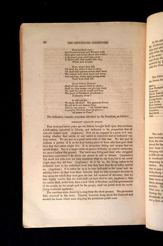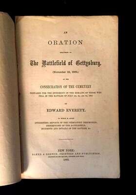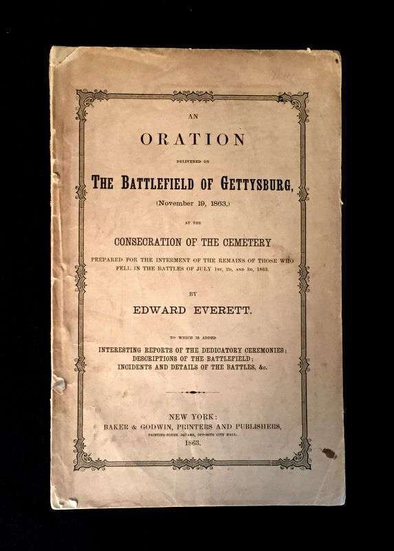 (Scranton Estate : Americana : Presidential). (Lincoln, Abraham.) Everett, Edward. An Oration delivered on the Battlefield of Gettysburg, (November 19, 1863,) at the Consecration of the Cemetery. New York: Baker and Godwin, 1863. 8vo, original sewn, printed tan wrappers; spine worn away, very minor creasing and small chipping at corners, a little toned, some scattered, generally light, dust smudging and minor spotting. Plan of the cemetery on p. 32. Light occasional internal foxing and minor dust smudging to title page, small abrasion in blank upper-middle fore edge margin of title and first 9 p. Internally, generally clean with good margins, no loss to printing on front or back wrapper.Howes E-233, ""First appearance of Lincoln's Gettysburg address in book form, antedated only by a 16-page pamphlet,"" The Gettysburg solemnities, ""which included a somewhat garbled version and of which only two copies are known.""Sabin 23263; Monaghan 193; Fish 314.