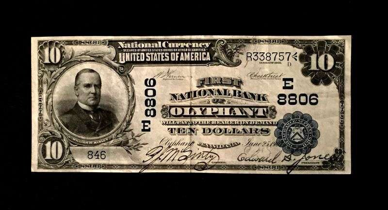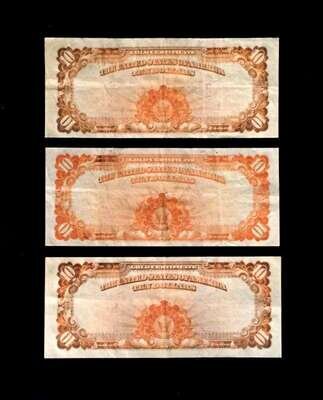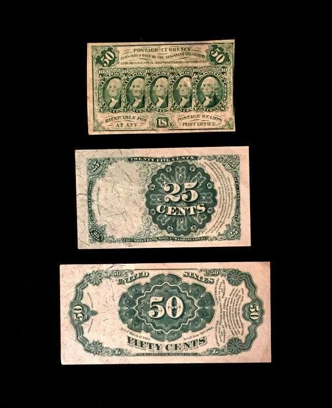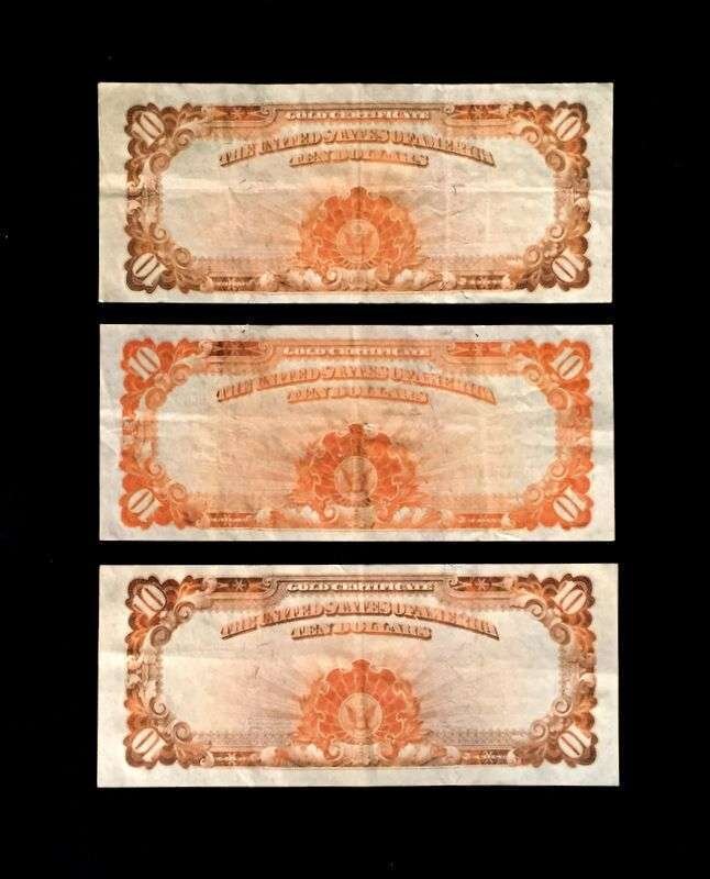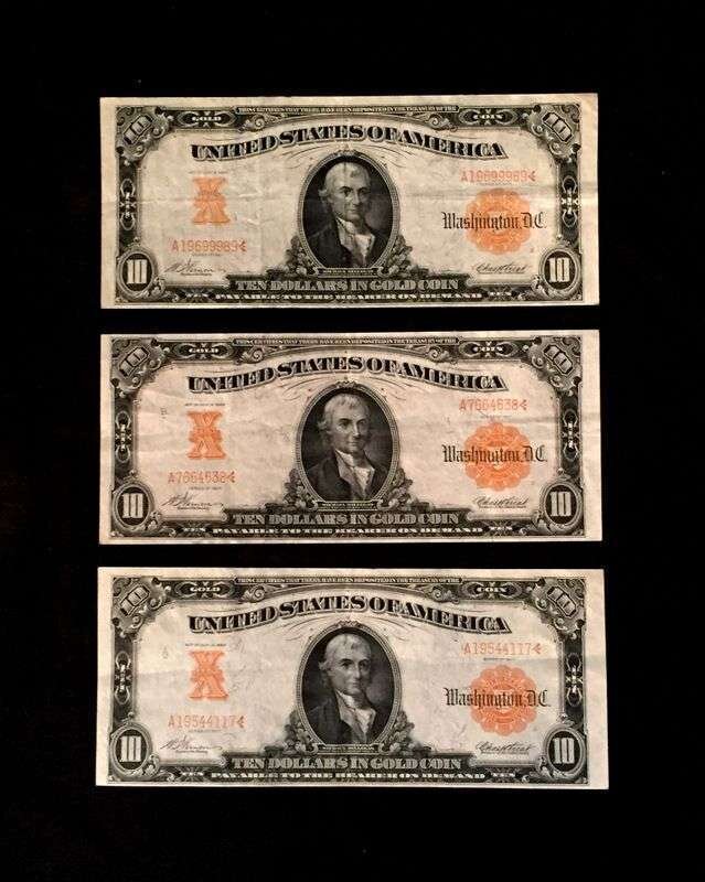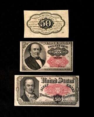 (Scranton Estate : Americana). 7 Pieces. U.S. Paper Currency: Gold Certificates (3). 10 Dollar Notes. 1907. Each Very fine-/very fine (a few light vertical creases). Friedberg 1167 * National Bank Note, Third Charter Period, Second Issue. 10 Dollar Note. Series of 1902. Very fine-/very fine (a few light vertical creases). Friedberg 618 * Fractional Currency. 25 cent note. 1874. Very fine-. Friedberg 1308-1309; 50 cent note. 1875. Very fine-. Friedberg 1380-1381; 50 cent postal currency. Very good+.