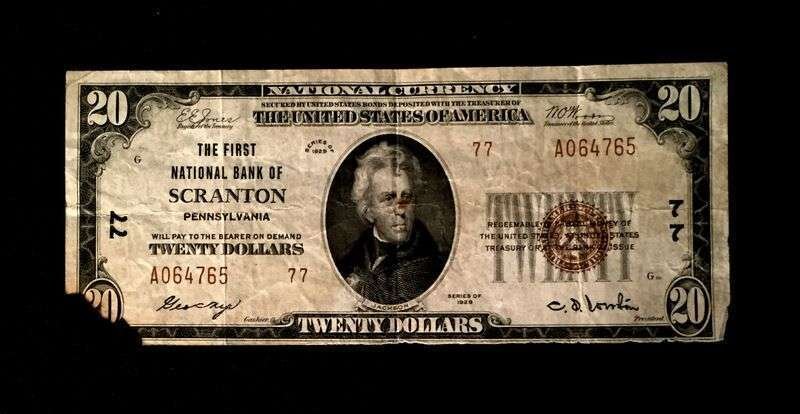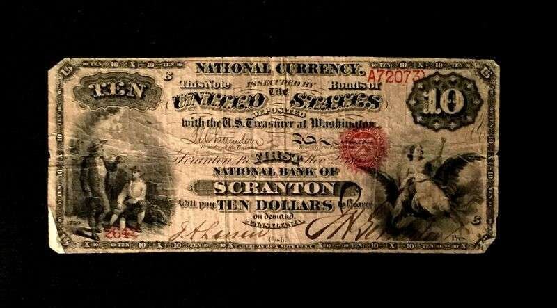 (Scranton Estate : Americana). 2 Pieces U.S. Paper Currency: (First National Bank of Scranton). National Bank Note, First Charter Period. 10 Dollar Note. Original Series, 1863. Fine (creasing, a few small close tears at edges - no paper loss). Friedberg 409 * Small Size National Bank Note. 20 Dollar Note. 1929. Good (bottom left corner torn away). Friedberg 1802-2.