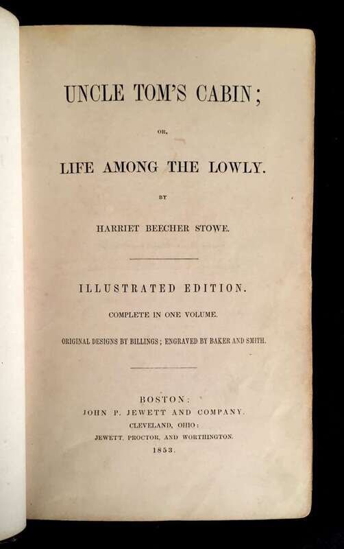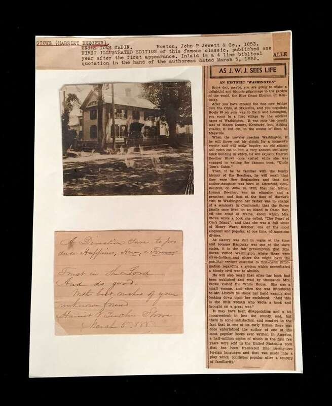 (Americana Africana). 1 Vol. and 1 Piece: Stowe, Harriet Beecher. Uncle Tom's Cabin. Boston: John P. Jewett, 1853. "Illustrated Edition." 8vo, original publisher's gilt-pictorial dark green morocco, t.e.g.; extremities rubbed. With frontispiece portrait, additional vignette title, wood engraved illustrations in text. Moderate internal spotting and dust smudging. First illustrated American edition. With Harriet Beecher Stowe inscribed autograph quotation signed laid in, "Trust in the Lord/ And do good," dated in her hand "March 5, 1888."