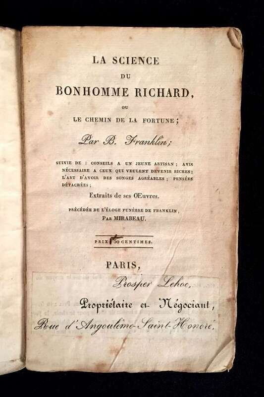 (Americana : Franklin Imprints). Franklin, Benjamin. La Science du Bonhomme Richard, ou le Chemin de la Fortune; Par B. Franklin;...Extraits de ses OEuvres. Précédée de l'éloge funèbre de Franklin, par Mirabeau. [Paris: Antoine Bailleul, 1823?]