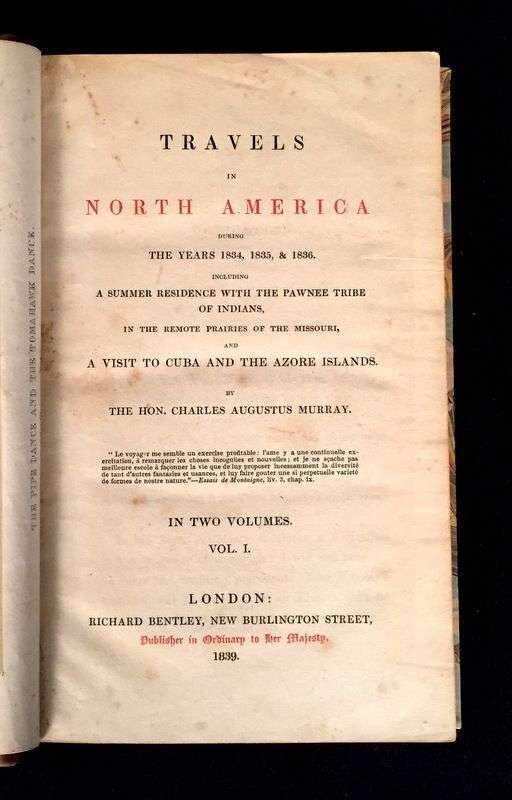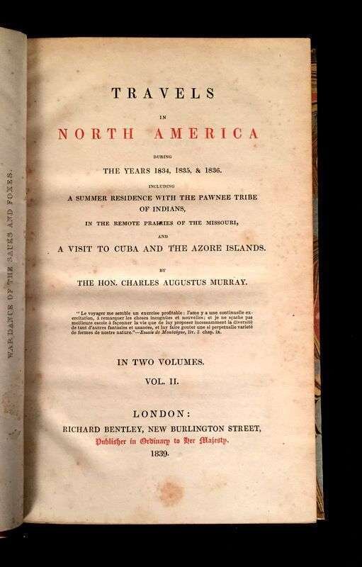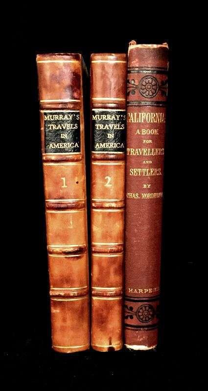 (Native Americana) 3 vol Lot: Murray, Charles Augustus. Travels in North America During The Years 1834, 1835, and 1836. Including A Summer Residence with the Pawnee Tribe... London: Richard Bentley, 1839. First Edition. 2 vols. 8vo, modern 1/4 calf and marbled boards, black morocco spine labels; spines scuffed, new endpapers. Tinted lithographic frontispieces. Light foxing to frontispieces, titles and front matter. Slightly trimmed. Howes M-913, "Best account of the Pawnees..." * Nordhoff, Charles. California: for Health, Pleasure, and Residence. New York: Harper, 1872. First edition. Large gilt-lettered terra-cotta cloth; corners and spine ends frayed, light wear to joints and edges. Fronispiece map, other maps, full-page and text wood engraved illustrations, advertisements. Slightly toned, scattered minor spotting.