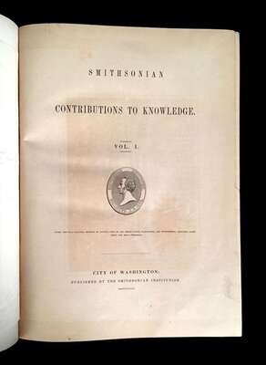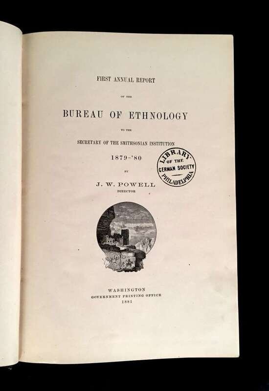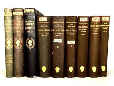 (Native Americana). 9 vol Lot U.S. Governmental Ethnography: (Smithsonian Institution, publisher). Powell, J. W. Annual Report(s) of the Bureau of Ethnology, Washington: G.P.O., 1881, 1883, 1884, 1887, 1888, 1891. The first, second, third, fifth, sixth, and seventh annual reports. Six vols. 4to, original gilt-pictorial cloth; light shelf wear. Plates, fold chats, text illustrations, maps and c. in cover pockets. Internally generally clean. * Smithsonian Contributions to Knowledge. Washington, 1848, 1851, 1852. Vols. 1 - 3. 3 Vols., large 4to, original cloth; light shelf wear. Plates, maps, etc. Internally generally clean.All 9 vols. ex-library - German Society of Pennsylvania ink stamps on title pages of the Ethnology reports; library labels on the front pastedowns of Contributions to Knowledge vols., also paper spine labels, other markings. Vol. 1 of Contributions, Mound Builders.