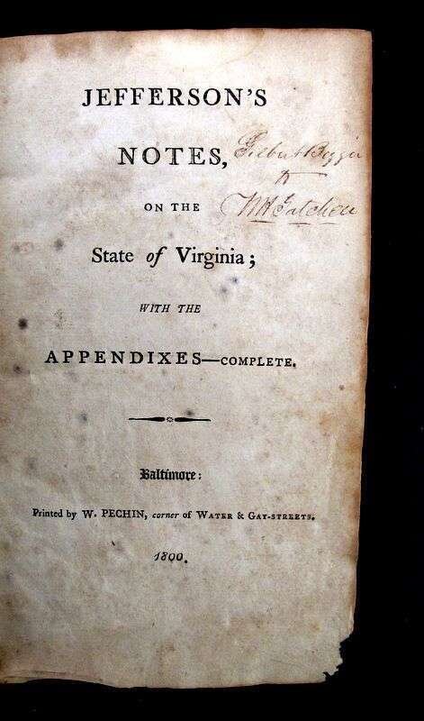 (Americana : Presidential). (Jefferson. Thomas.) Jefferson's Notes on the State of Virginia; with the Appendices - Complete. Baltimore: W. Pechin, 1800.
