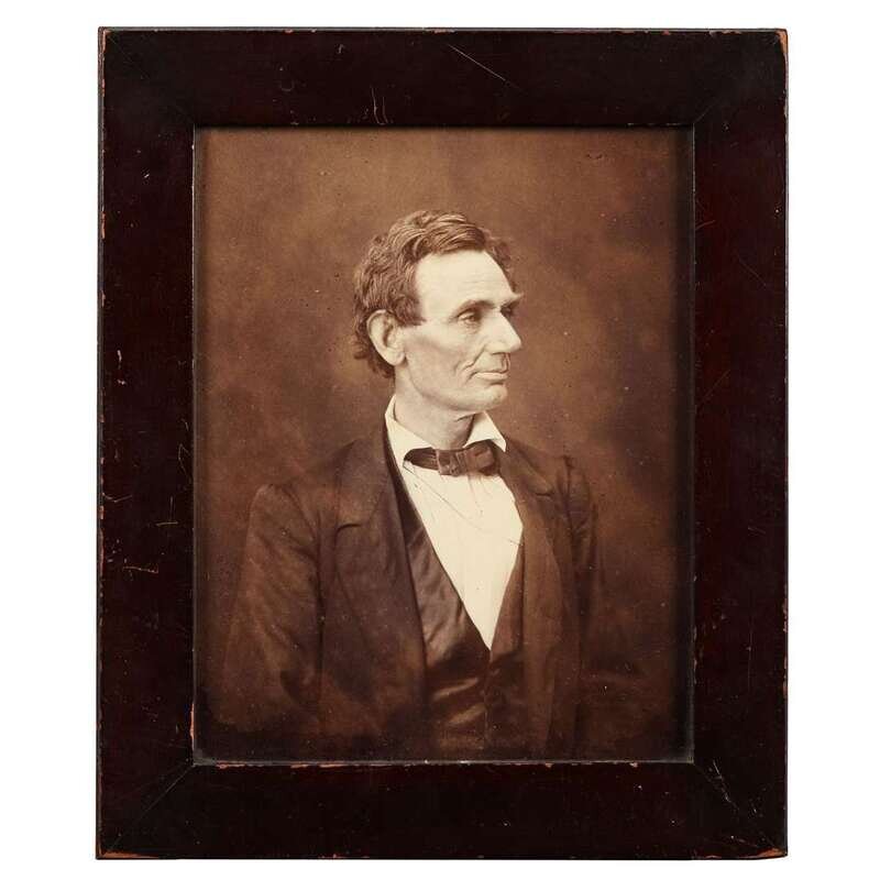 (Americana : Presidential). Hesler, Alexander; Ayres, George B. Portrait of Abraham Lincoln. Albumen print. 1 piece. 8 5/8 x 6 3/4 inches; 218 x 173 mm. On original board; very minor edge wear. Printed by George B. Ayer, ca 1881 - 1899, printed from negatives produced from Alexander Hesler's negative of his photo of June 3, 1860. With Ayers blind 1881 copyright stamp at the bottom left corner and his ink annotations on the back of the board. "Copyright/ Geo B. Ayers/ Philadelphia." Some toning to back of board, photo clean and attractive. Accompanied by its period frame. See Meserve 26.