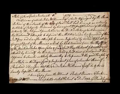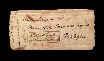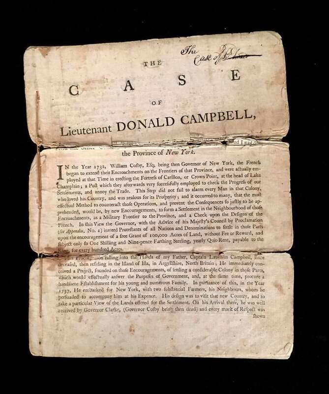 (Americana : State History). Lot of 18th-century Printed and Manuscript Material Relating to N.Y. State History, Most Especially to Donald Campbell. Includes: The Case of Lieutenant Donald Campbell [and Other Children of the Deceased Capt. Lauchlin Campbell, of the Province of New York.] Drop head title. [London(?), 1767(?)]. Printed pamphlet, 16 p., 4to, original self-sewn wrappers; split or splitting along old horizontal folds (having divided the pamphlet into roughly equal third sections), resulting in small losses to printing, scattered light printing, contemporary (and a few later) ink annotations. Setting forth Campbell family claims to a grant of land in the province of New York. OCLC 64152980 (mostly recording microfilm copies); not recorded by Sabin. * Manuscript document, copy executed in 1784 by Donald Campbell of a 1779 Resolution of Senate of New York document relating to the expulsion of John Williams from the Senate of New York for fraud relating to militia pay. 1 p., oblong 8vo, docketed on verso; some browning at edges. * Manuscript Continental Congress address leaf to Philip Livingston at Philadelphia with the signed receipt note of Colonel Campbell, New York. 3 x 6 1/2 inches; 80 x 165 mm. Some smudging.