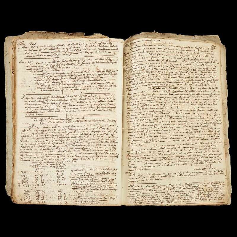 1 vol in folio, 170 pages: (1p blank), 1p index, 1-170. Approximately 200 retained letter copies. Original wrappers; some chipping and occasional ink stains. Text and pagination in brown and black ink; slightly toned, some chipping to edges with no appreciable loss of text. Discussions of the author’s own theories regarding the causes of the notorious Yellow Fever outbreaks in Philadelphia, PA, based especially on retrospective observations of weather patterns and their correlation with contagion (see esp. p 118, a letter to Dr. Thomas James, President of the Board of Public Health, and pp144-151 passim). Other, frequent comments on responsibilities as public figure, having been Speaker of the PA House of Representatives one year earlier; his business affairs and personal life, including bouts of anxiety and depression; and collaborations with the Pennsylvania Hospital and the Philadelphia Board of Property. Of interest, too, is a 3pp proposal for the Schuylkill and Tulpehocken canal projects .* Includes also 3 loose manuscript leaves (from another letter book but in the same hand, paginated 205-210), and 22 pages letter copies (loose) pertaining to the financial affairs of multiple members of the Evans family.