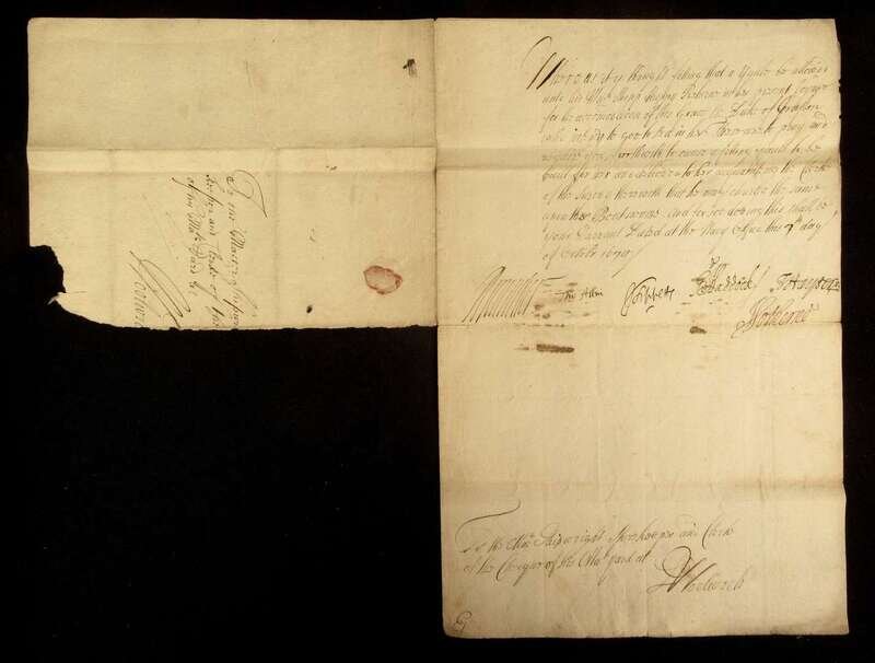 (Manuscripts). Allen, Thomas; Haddock, G.; Harper, T.; Lippett, J. - British Naval officers. October 7, 1679. 1 Piece. Manuscript Document Signed. 2 leaves, folio, ICL, torn address leaf. To the workers at Woolwich, allowing a yawl for his Majesty's ship "Happy Return" for the accommodation of the Duke of Grafton.