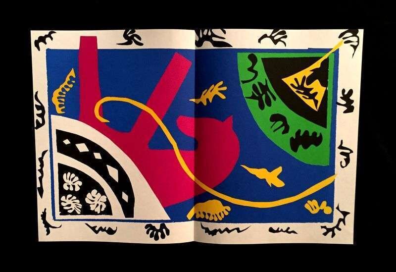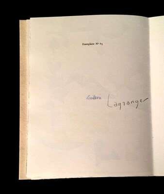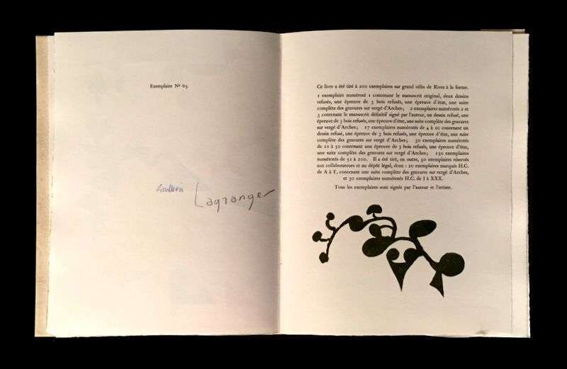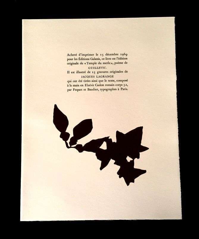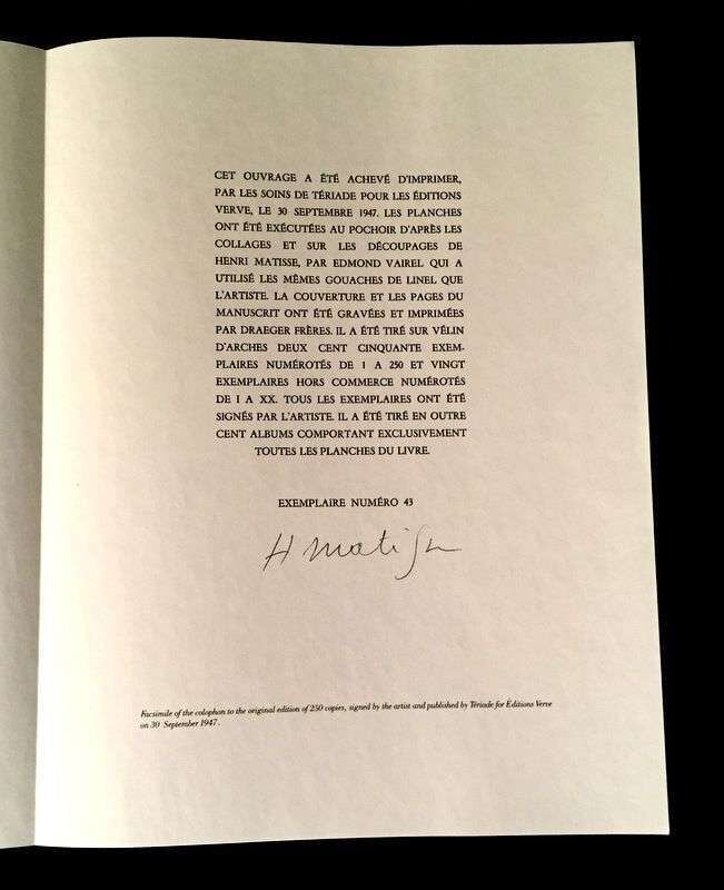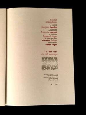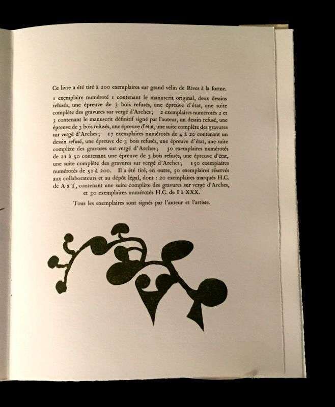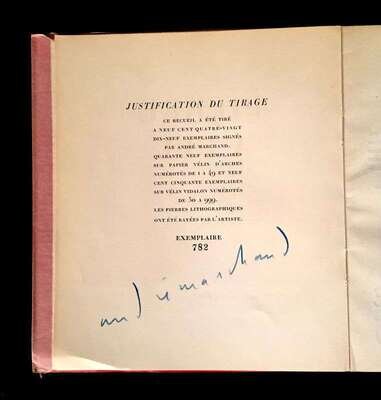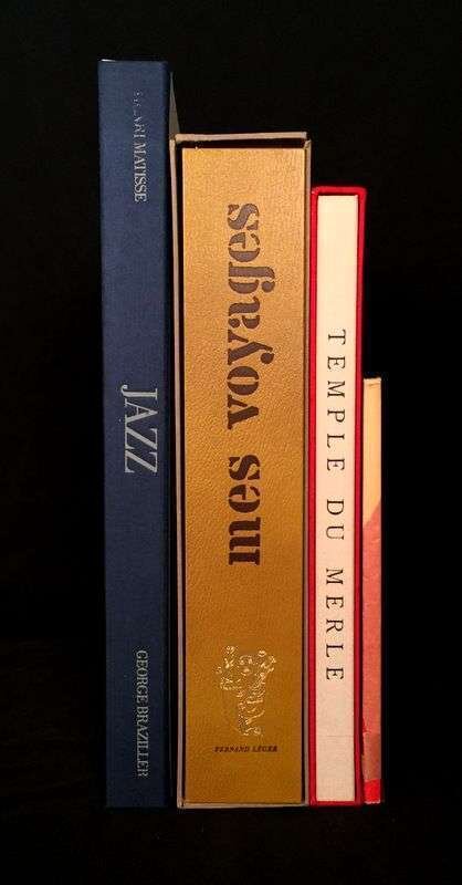 (Marchand, Andre, illustrator.) Pierre a feu. Cannes: Maeght, (1945). #782/950 signed in blue crayon by Andre Marchand. 4to. Original color pictorial lithographic wrappers; light creasing at bottom fore edge corner, glassine (some chipping). With 50 black and white lithographs. Illustrated. Light crease at bottom fore edge corners, internally clean. * (Leger, Fernand, author and illustrator). Aragon. Mes voyages. (Paris), (1960). But facsimile edition (250 x 350 mm) Folio, loose as issued in printed wrappers, mustard morocco-backed chemise, slip case. With the separate suit of illustrations. Generally clean and crisp, top joint of slipcase cracked. * (Legrange, Jacques, illustrator.) Guillevic. Temple du merle. (Paris): Galanis, (1969). #65/150 (of 200) signed by Legrange and Guillevic. 4to, loose as issued in pictorial wrappers, cloth chemise and slipcase. With 15 original color wood engraving. Light to moderate spotting to wrappers, light wear to slipcase joints. * Matisse, Henri. Jazz. New York: Braziller, (1983). Folio, loose as issued in original wrappers, blue cloth-backed portfolio box, grey boards blue printed cover label. Illustrated throughout. Clean and crisp. First edition thus.