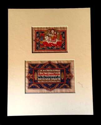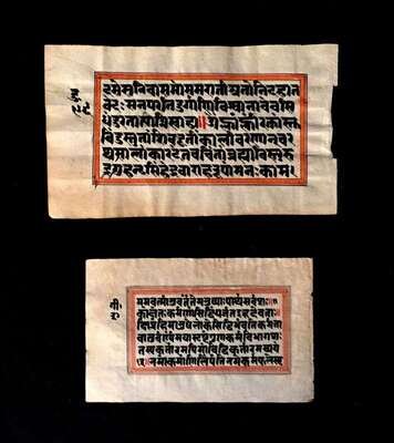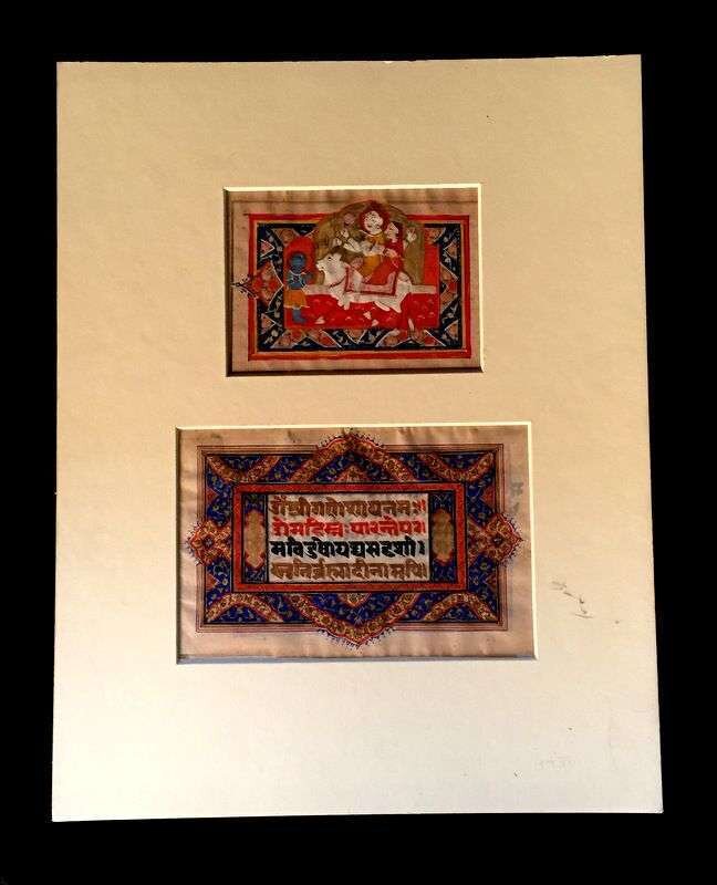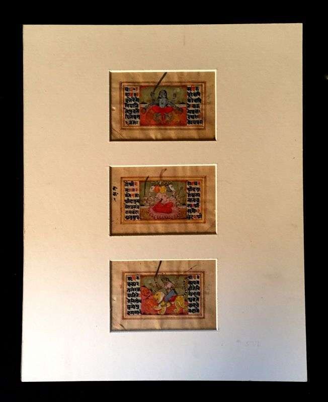 (Manuscripts : Illuminated). 19 Pieces. Indian Manuscript Leaves and Miniature Paintings. 14ms. leaves, 3 with illuminations (2 illuminated recto and verso - 5 small format miniature paintings, mythological subjects - all ca. 19th century. Provenance: purchased as auction lot offered from the estate of Elvin O. Bellak.