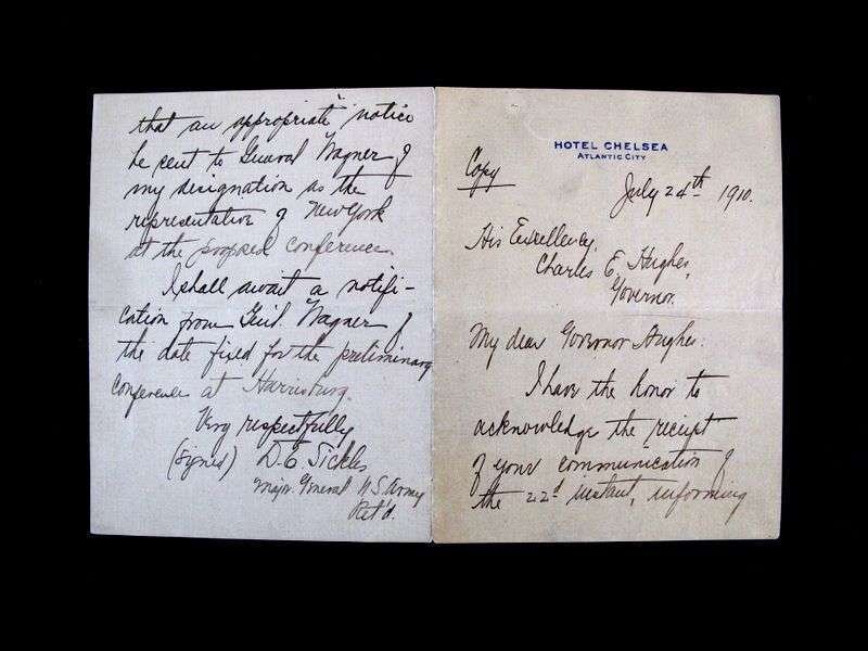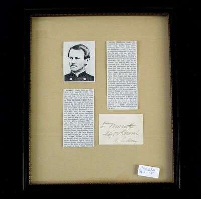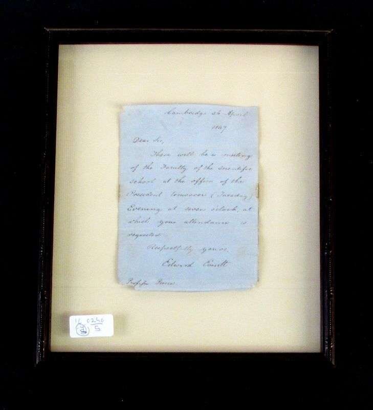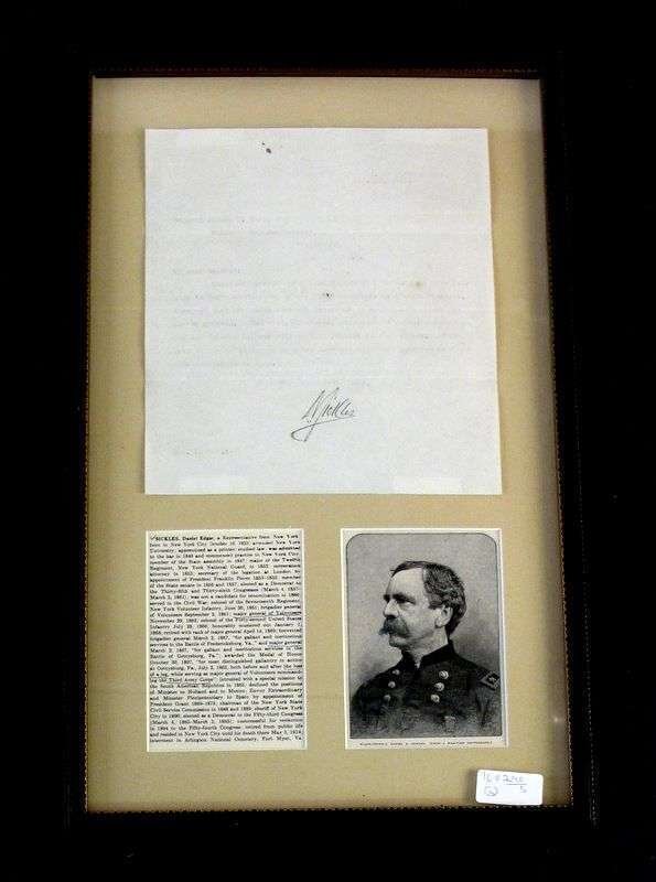(Autographs : American Civil War Notables) 4 Pieces: Everett, Edward. Autograph Letter Signed. Cambridge, April 26, 1847. 1 p., 12mo; light creasing at old folds. To professor Pierce, requesting his presence at a faculty meeting of the scientific school. Clean and clear. Framed. * Merrit, Major General Wesley. Card Signed. Clean and clear. Framed. * Sickles, (Major General Daniel Edgar). Typed letter signed. 1 p., 4to, contents faded, signature clear and strong. * Sickles, Major General Ret'd, (Daniel Edgar). Secretarial copy. Atlantic City, July 24, 1910. 3 p., 4to; creases along old folds. To Charles E. Hughes, Governor of New York, accepting his appointment to represent New York State at the 50th anniversary of the Battle of Gettysburg.