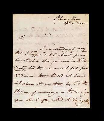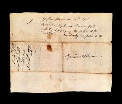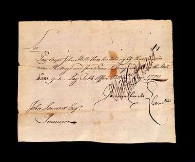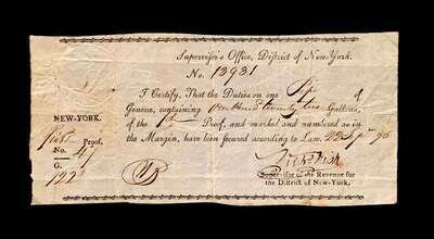 (Autographs : American Revolutionary Figures). 4 Pieces: Fish. Nicholas. Document Signed. New York, September 22, 1796. 1 p., 3 1/2 x 7 inches; 90 x195 mm, docketed on verso, minor creasing. Partly printed document signed as Supervisor of the Revenue for the District of New York. Fish, Nicholas (1753- 1833), American Revolutionary War officer, friend and associate of Alexander Hamilton. Generally clean and clear. * Proctor, (General) Thomas. Document Signed. Philadelphia, May 31, 1799. Folio land indenture on vellum; some dust smudging. Signature clear, generally strong. Proctor, Thomas (1739-1806), American Rvolutionary War officer, commanded the 4th Continental Artillery Regiment, played an important part in the battles of Brandywine, Germantown, and Monmouth. * Rawdon-Hastings, Francis, first Marquis of Hastings, second Earl of Moria. Autograph Letter Signed. London, September 8, 1800. 3 1/2 p., 4to; light creasing along old folds.To Mr. Nichols, relating to travel. Rawdon-Hastings, Francis (1754-1826), British soldier and statesman, at the battles of Bunker Hill, Brooklyn and White Plains. * Wolcott, Oliver (fils). Manuscript Document Signed. (Connecticut), October 30, 1779. 4to sheet; creases along old folds. Dark, strong signature. Wolcott, Oliver (1760-1833), public official, second Secretary of the U.S. Treasury.
