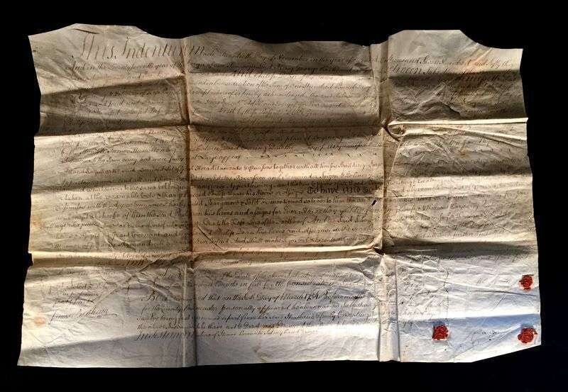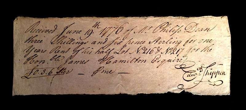 (Autographs). Shippen, Edward. Two (2) Manuscript Documents Signed: Lancaster County Pennsylvania folio Land Indendure on parchment, November 20, 1753; signed by Shippen for the Lancaster County Office for Recording a Deeds, January 12, 1769. Worn & creased, but generally strong Shippen signature. * Rent receipt, for James Hamilton Esquire. ( Philadelphia?), June 19, 1776. 2 3/4x 7 1/2 inches; 70x190mm. Clean with dark signature.