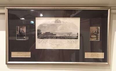 (Autographs : Royalty). 1 Piece. Cut Signatures (2). Victoria, Queen of England; Albert Prince Consort of Victoria of England. Framed with carte-de-visite portraits and an engraving of the Crystal Palace. Generally strong signatures on dusty backgrounds, small fissures just touching Victoria.