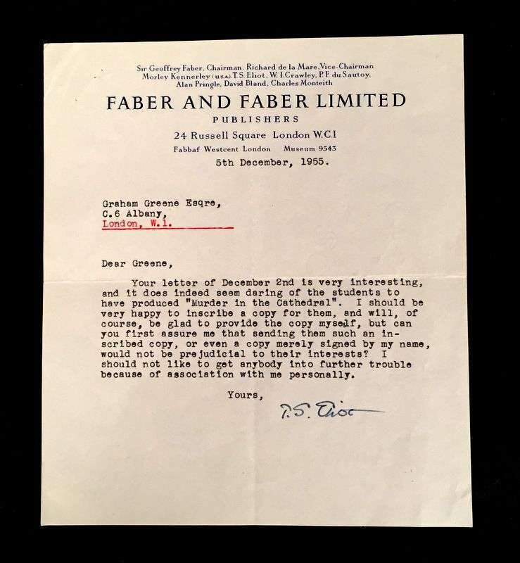 (Autographs : Literary). Typed Letter Signed. Eliot, T.S. London, December 5th, 1955. 1 p., 4to; light vertical crease alone old fold. On Faber and Faber letterhead, to Graham Greene, responding favorable to Greene's request for an Eliot inscribed copy of Murder in the Cathedral for students undertaking a production of the play.