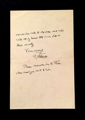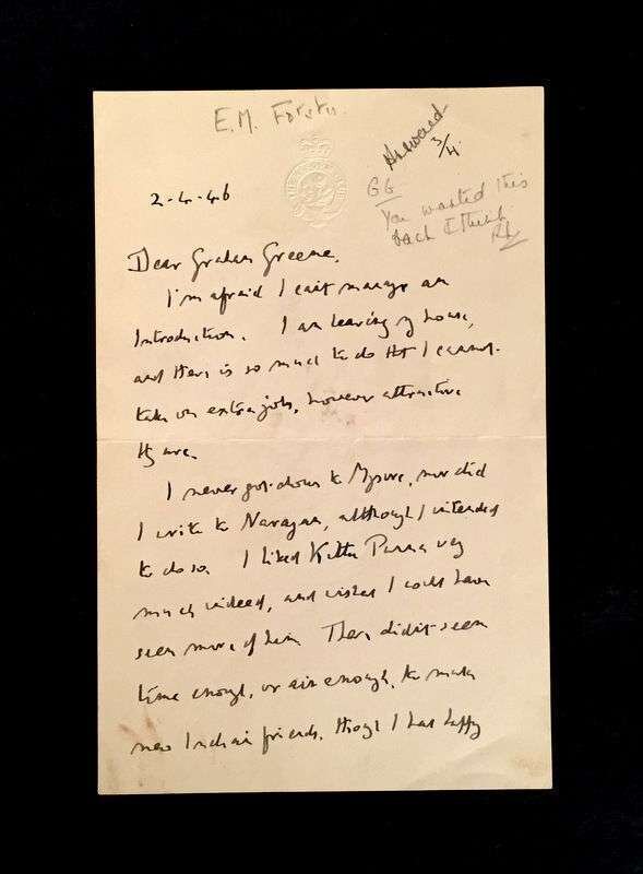 (Autographs : Literary). Letter Signed. Forster, E(dward) M(organ). No place, 2-4-[19]46. 2 p., small 8vo; light crease along old fold, very slightly dusty. To Graham Greene, "I'm afraid I can't manage an introduction..."