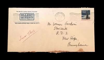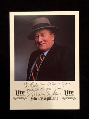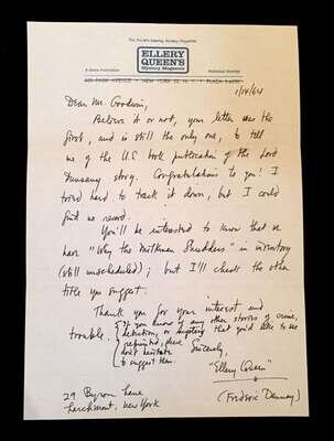 (Autographs - Literary). 2 pieces American Mystery and Detective authors: "Queen, Ellery." Autograph Letter Signed. Lartchmont, New York, January 14, 1964. 1p., 4to. On Ellery Queen's Mystery Magazine letterhead, to Mr. Goodwin, relating to the publication of a Lord Dunsany story. Signed as both "Ellery Queen," and "Fredeic Dannay.". With postal envelope addressed in Dannay's hand. * Spillane, Mickey. Lite Beer All Stars color photo card signed and inscribed.