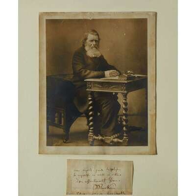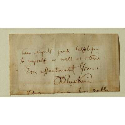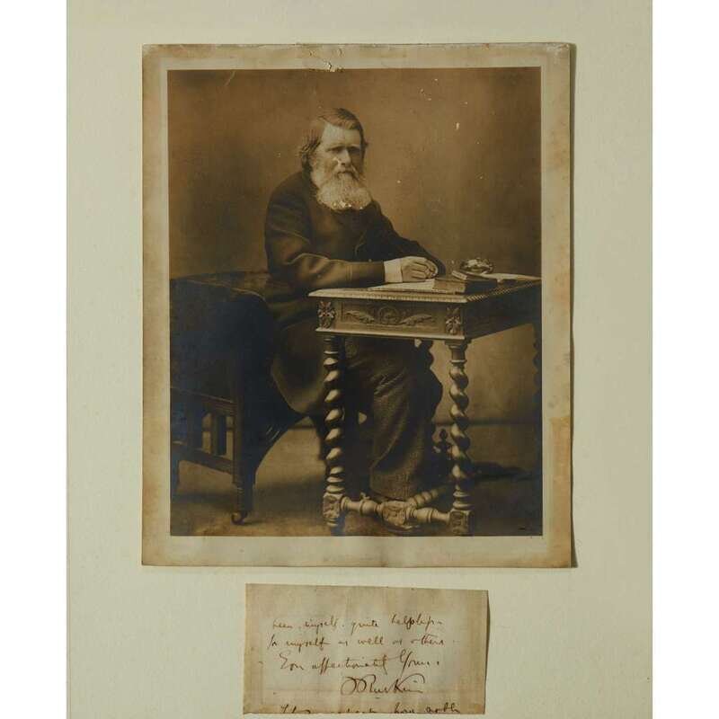 (Autographs : Literary). Letter Closing Signed, framed with photo portrait by William Barraud (albumen print, ca. 1885, 10 x 8 inches; 254 x 203 mm - sheet size; some creasing, a few small chips in image. Ruskin, full figure, seated on aesthetic movement chair, with notation on accompanying sheet, "John Ruskin/ sent to me by/ Christiana Rossetti/...1890".