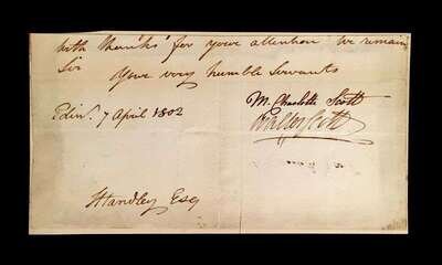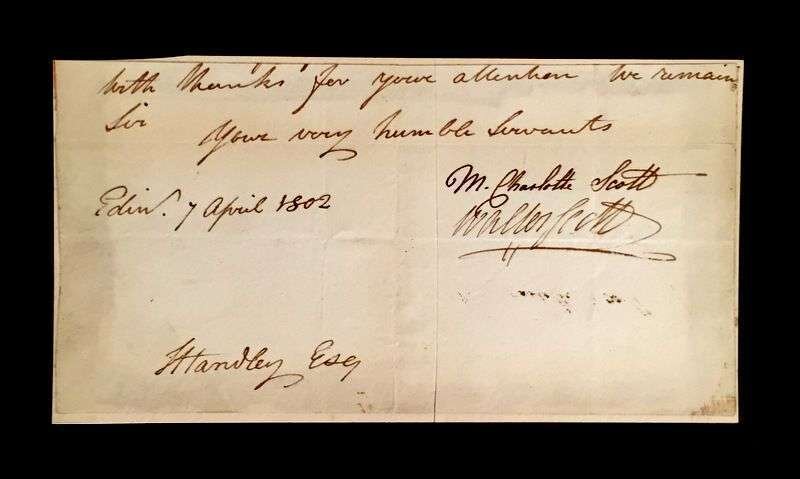 (Autographs : Literary). 1 Piece. Letter Closing Signed. Scott, [Sir] Walter. Edinburgh, April 7, 1802. 4 x 7 1/2 inches; 99 x 190 mm; mounted on heavy paper sheet. Also signed by his wife, Charlotte Scott in whose hand the letter closing was executed. Scott signature clear but a little light.