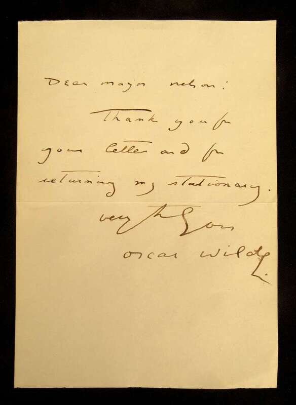 (Autographs : Literary). Wilde, Oscar. 1 Piece. Short Autograph Letter Signed. No place, no date. 1 p., 4to; minor wear. "Dear Major Nelson/ Thank You for/ your letter and for/ returning my stationary./ very truly yours/ Oscar Wilde."
