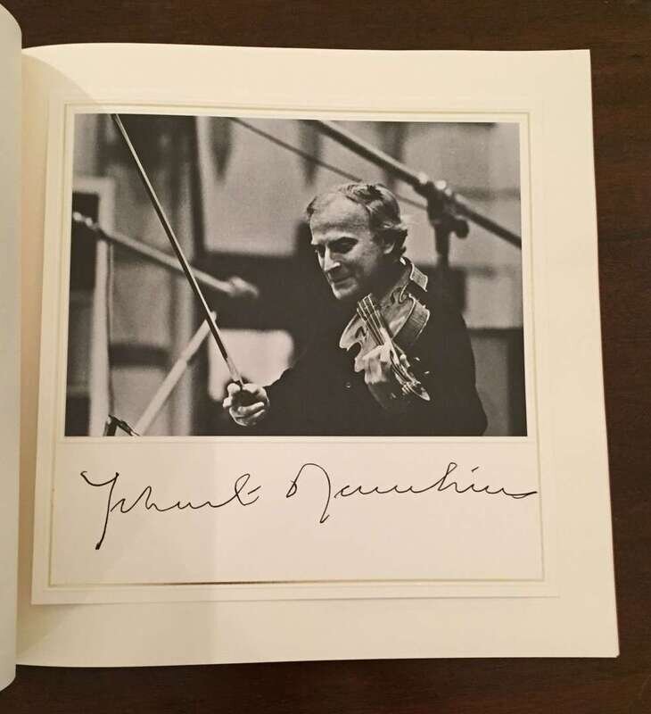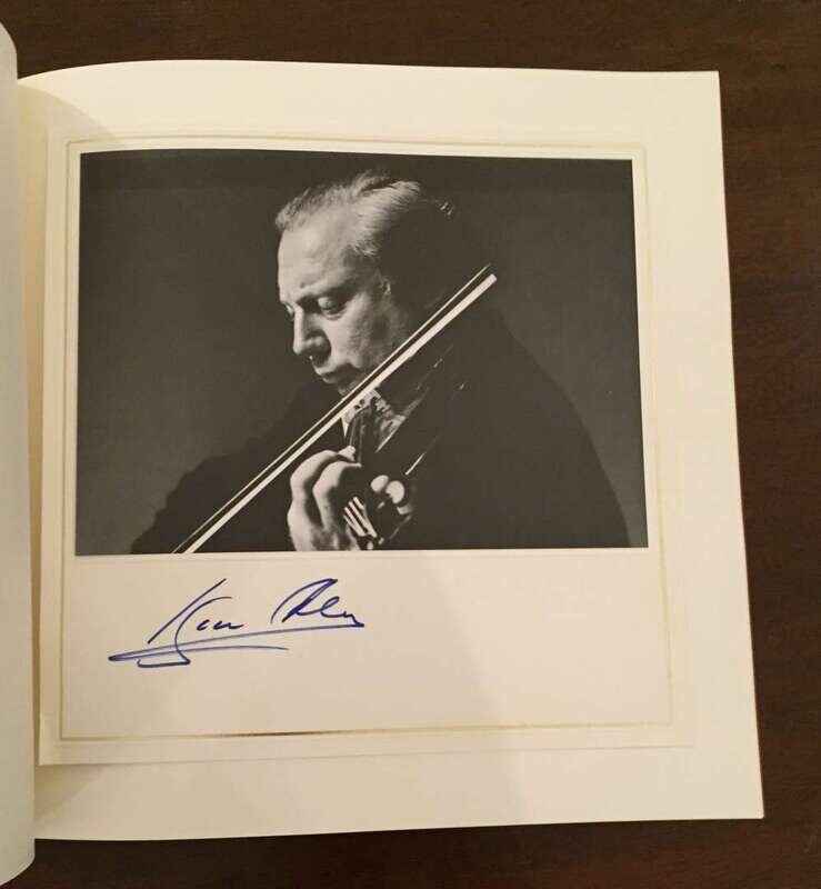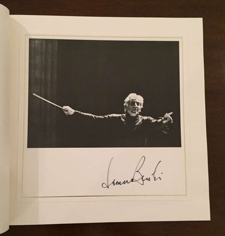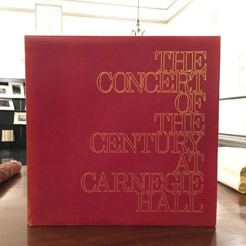 (Autographs : Music and Performing Arts). 1 Vol. (Carnegie Hall.) The Concert of the Century at Carnegie Hall. (New York), (1977). #412/1,000. 4to, original gilt-lettered polished burgundy calf folding binding, holding internal text and photo volume in gilt-lettered russet cloth and phonograph album. The internal volume contains 6 mounted photographs each signed on its mount by its subject: Leonard Bernstein, Dichter Fischer-Dieskeu, Vladimir Horowitz, Yehudi Menuhin, Mstislav Rostropovich, Isaac Stern. In original marbled board slipcase. Stress at joints of slipcase, spine of calf binding a little scuffed. Internally clean and bright.