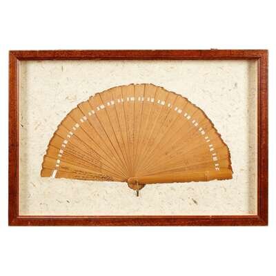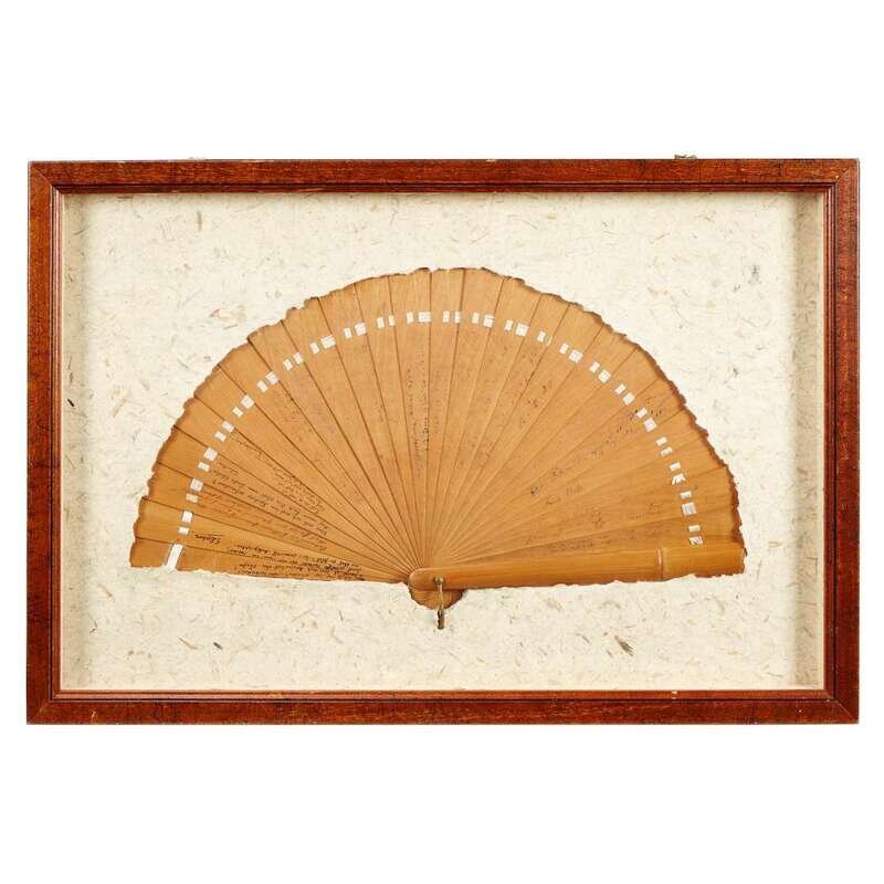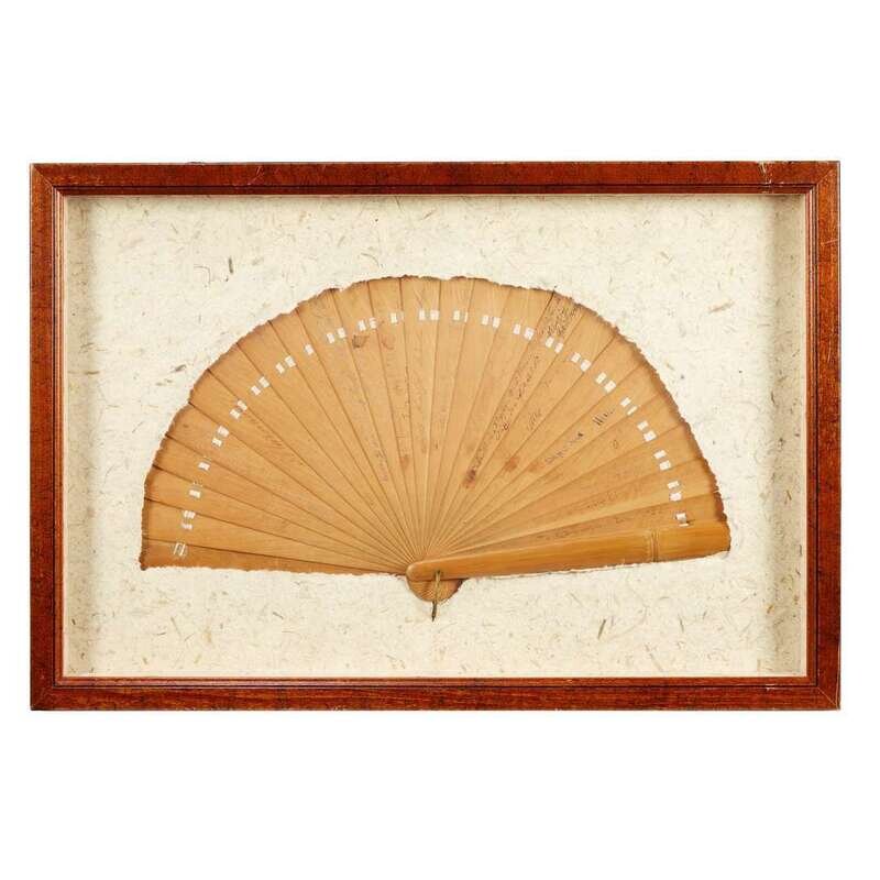 1 Piece. (Mahler, Gustave, et al.) Fan Signed. Mahler, Gustav; Klemperer, Otto; Schnabel, Arthur; Betz, Franz; Dohm, E.; and approximately 30 others active in German artistic and cultural life. Ca. late 19th century - 1933. Silk-threaded wood panels, about 10 x 18 inches; 254 x 457 mm; in double-paned shadow box. Includes inscriptions and musical quotations. Signatures in widely varying states of preservation. Mahler signature relatively dark and clear.